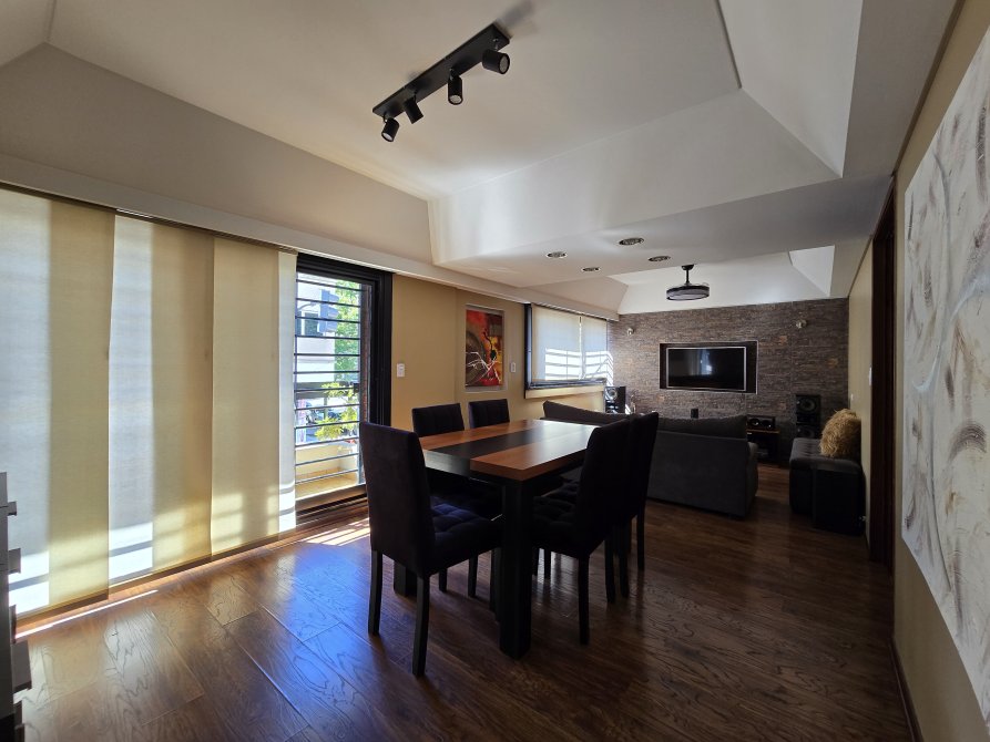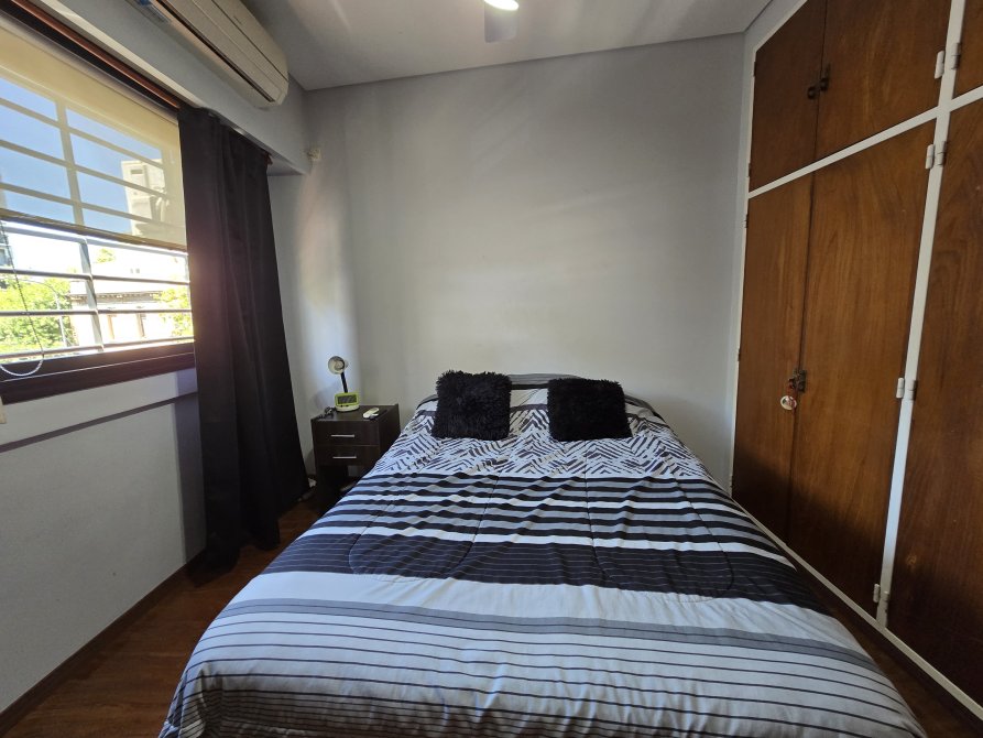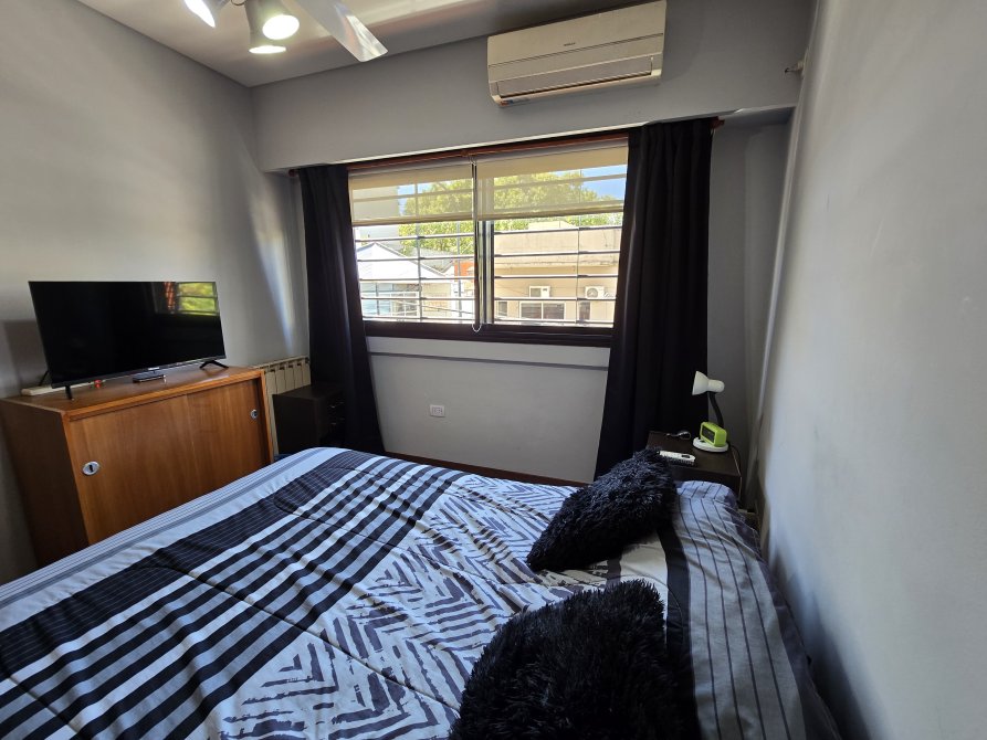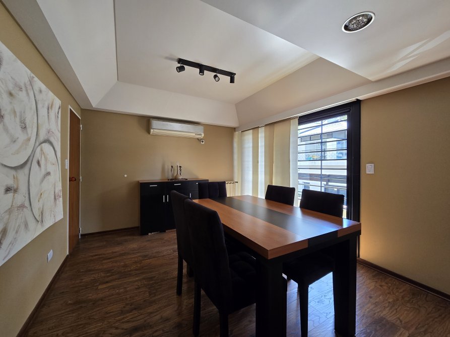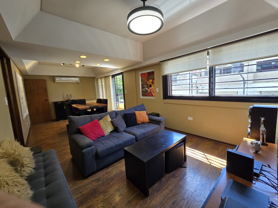 Amplio living comedor con doble circulación, equipado con aire acondicionado frío-calor de 7000 frigorías y salida a un balcón.