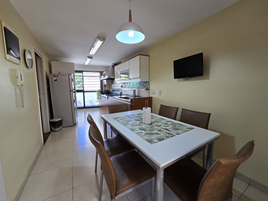 Cocina amplia con comedor diario, equipada con anafe de 6 hornallas y plancha, horno a gas Longvie con tiraje directo al extractor (¡olvidate del humo y los olores en toda la casa!), muebles bajo mesada y alacenas nuevos.